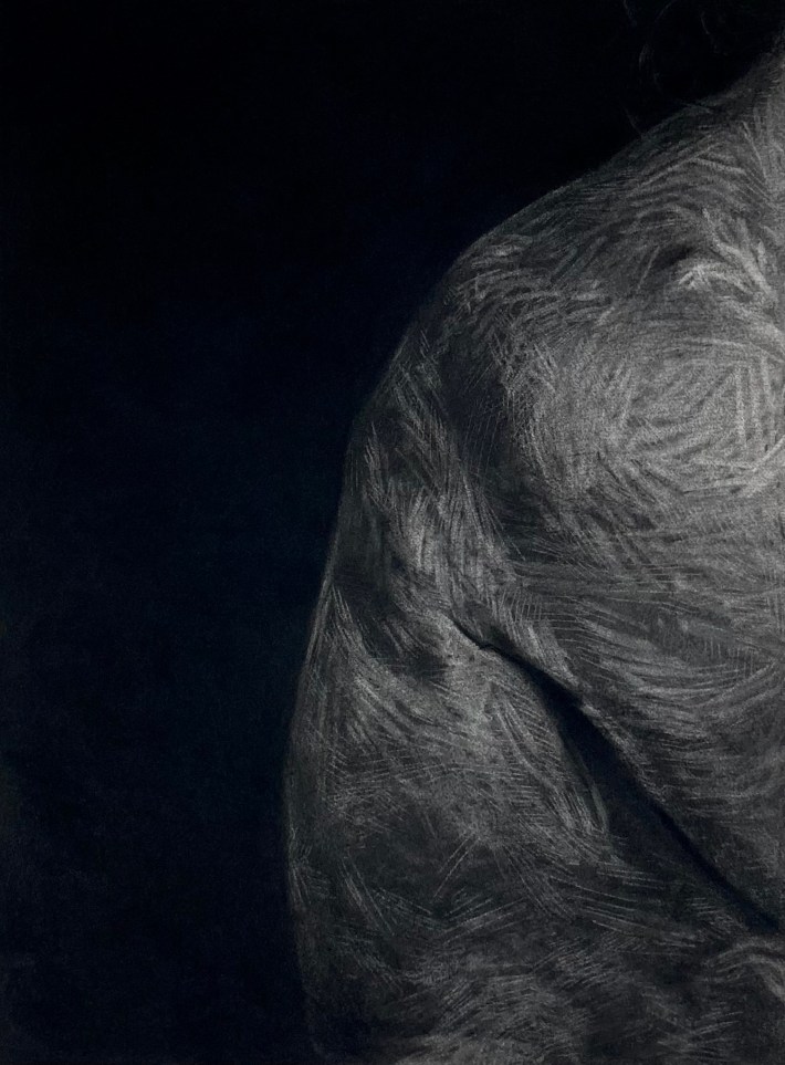 "Flesh & Flame" is a drawing-based installation that uses charcoal, poetry, and dark charcoal voids to evoke the integration of mind and body. A monolithic figurative drawing, relying on reductive mark making and deep blacks, creates a lush and immersive surface to anchor into the physicality of the body, while the surrounding poetry digs into the emotional complexity of reconnecting with that physicality. The installation will confront the body as both person and object outside of the technosphere of media. The concept is deeply rooted in coming to terms with a body haunted by chronic pain and fatigue.
