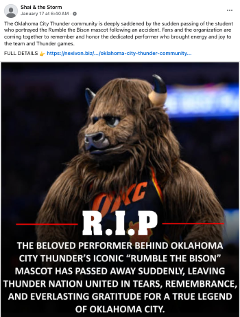 The thing is, it’s fake. Landis Tindell, a spokesperson and manager of corporate communications for the Oklahoma City Thunder, confirmed by phone on Monday that no performer who plays Rumble the Bison in any capacity for the Thunder has died in the last month.