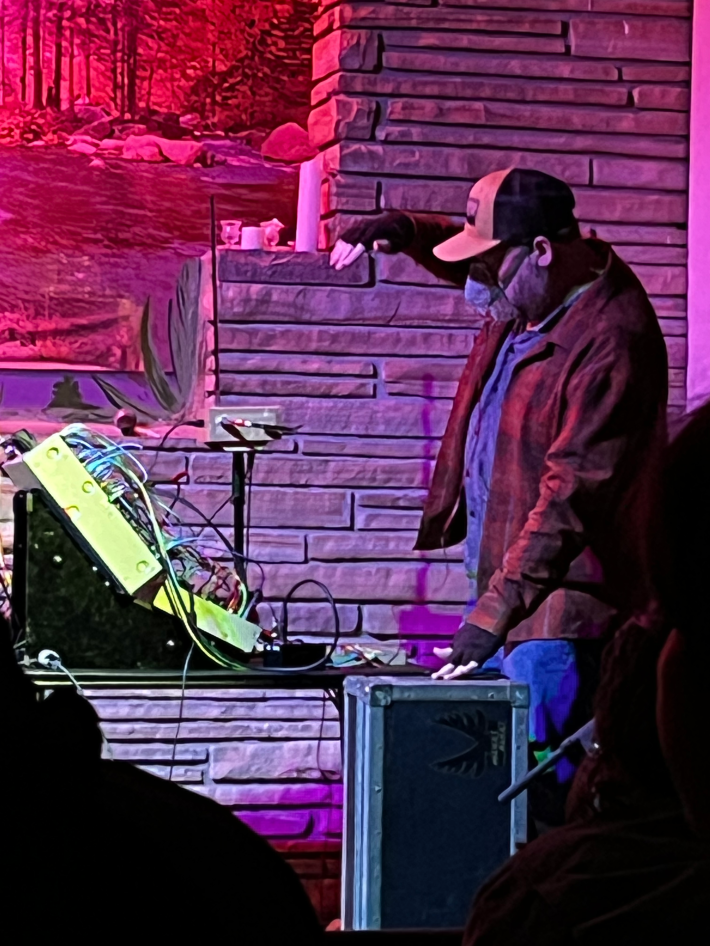 I might have actually gone to another world for a second, because the next thing I knew, Broome was honking into an industrial face mask and banging on a speaker with light-responsive sound gloves and plugging fluorescent cables into a synthesizer, and Southerland—an endlessly joyful experimental horn player—was playing two saxophones at once after giving us an analog experience of surround sound by standing behind the crowd blowing into a flailing plastic tube. This duo set was a lumbering, hilarious, virtuosic interlude that scrambled my brain with rhythmic shocks, warp-speed echoes out of nowhere, and a full array of squawks and whirrs and electric charges that went nowhere and everywhere at once.