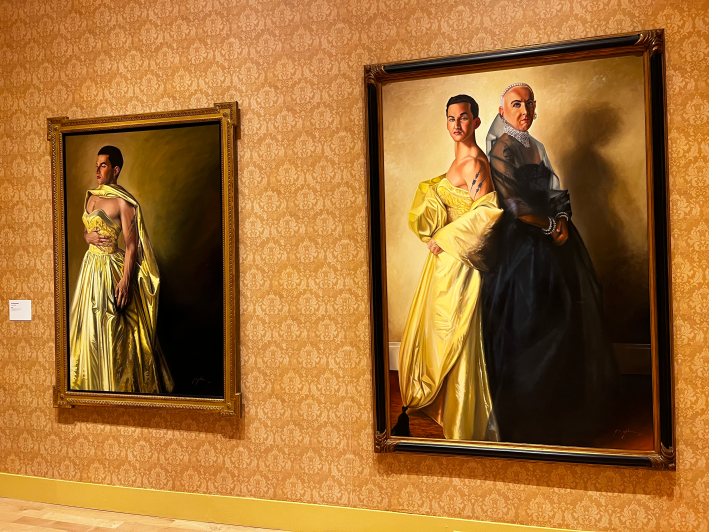 We see prominent Tulsans; forthright children; even—set into a room of their own—a series of exquisite men wearing ballgowns that are both armature and adornment, calculation and expression. The textures of those gowns are as sumptuous as the petals of his roses, and the stances of the men are as striking as his floral arrangements.