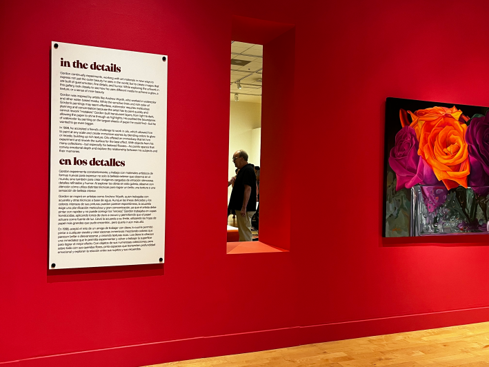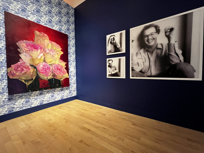 With its multiple jewel-toned rooms and wallpapered walls with little openings cut into them, Wall Flowers feels like a life-size theatre set that you can walk around inside of. One room features an overstuffed floral couch, next to which Gordon kept regular live-painting studio hours during the run of the exhibit. This sensitive show is as much about the artist as about the artist’s work—which, for a man who paints 10 hours a day, every day, is an appropriate and beautiful tribute. But it's also a space of abundant generosity: peeking through those “windows” in the walls, one can imagine oneself in one’s own home, seeing many-layered scenes and phases of life from a single place.
