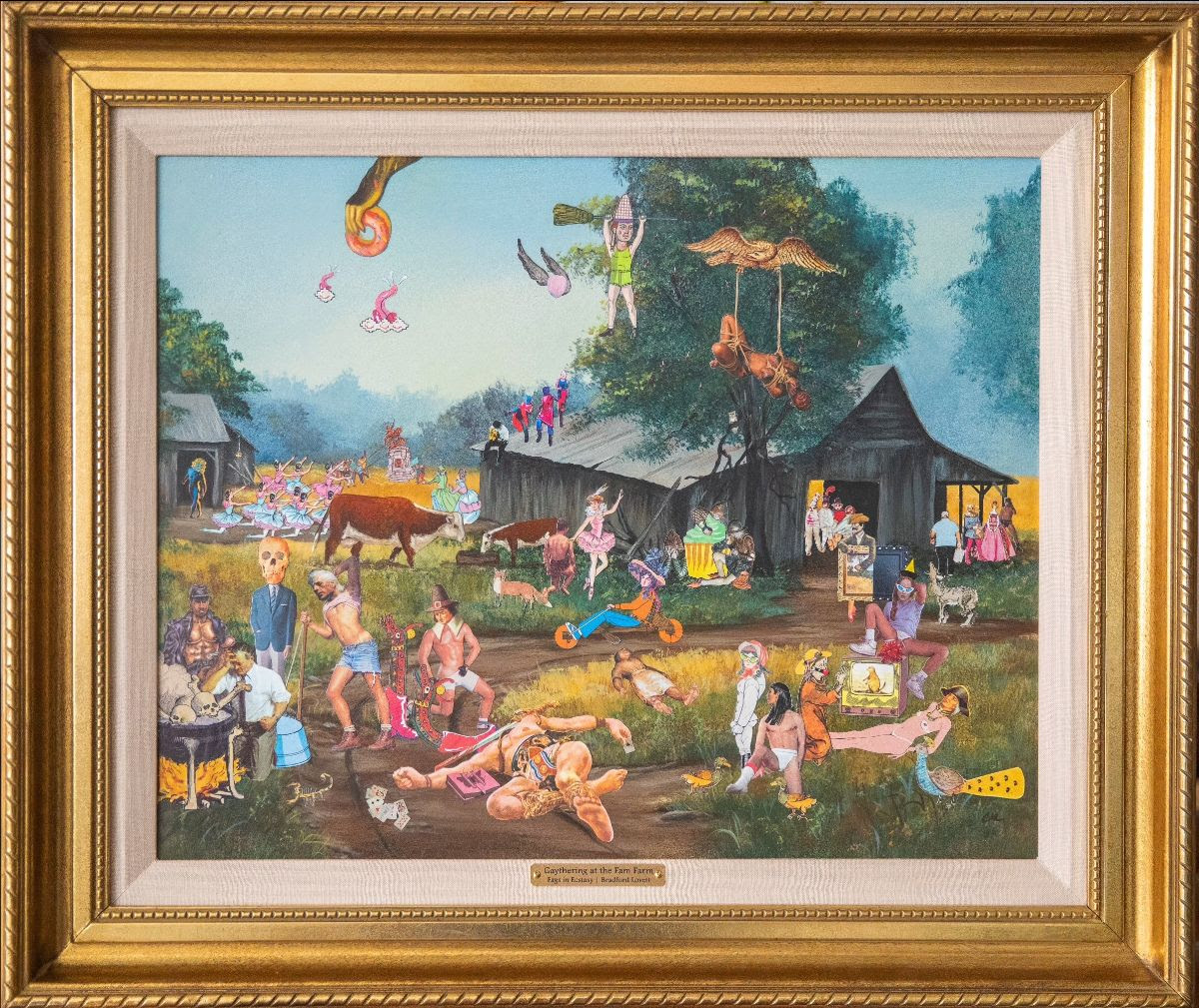 In Bradford Lovett’s Gaythering at the Fam Farm, a disembodied hand reaches down from the sky with a pink donut in its fingers, almost making contact with jubilant tongues rising from little floating Mario clouds. A dude with gold-plated pecs sits next to a man in white shirtsleeves who’s groaning over a cauldron full of bones, with two apocalyptic creatures in shiny red boots poised nearby and a slain Goliath in the foreground. A pair of cows holds space with a ballerina and a giant frosted cupcake as a witch-hatted Boy Scout rolls by on a recumbent wooden bike and a dragon carries a bound figure away over the peak of a falling-down barn.