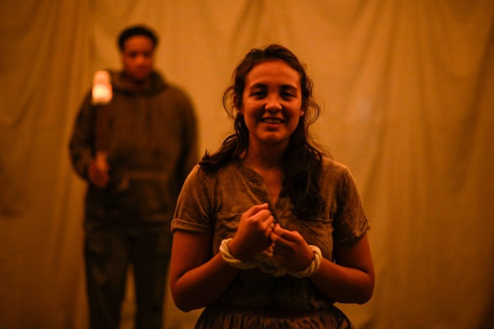 From the beginning of the production, performed in the nontraditional space of 101 Archer’s gallery, the play situated itself within this emotional terrain. Mulgrew’s version opened with Antigone’s sister Ismene (Élle Evans), not as a passive figure, but as someone palpably exhausted by loss, already aware of the weight of what has been passed on to her. She and her sister are the daughters (and sisters) of Oedipus, conceived amid a terrible prophecy; they now live in a Thebes torn apart by that prophecy’s aftermath.