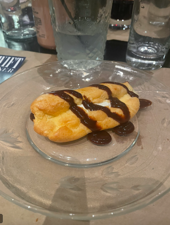 As for the food, surprise! That’s not the point either. There’s very little cohesion here; the goal is more “what’s a clever on-theme pun?” The first dinner I attended consisted of an elevated fried cheese paired with spicy maple syrup, an underwhelming charcuterie plate, and a pretty satisfying steak and mashed potatoes dish. We also had eclairs for dessert, which were not memorable.