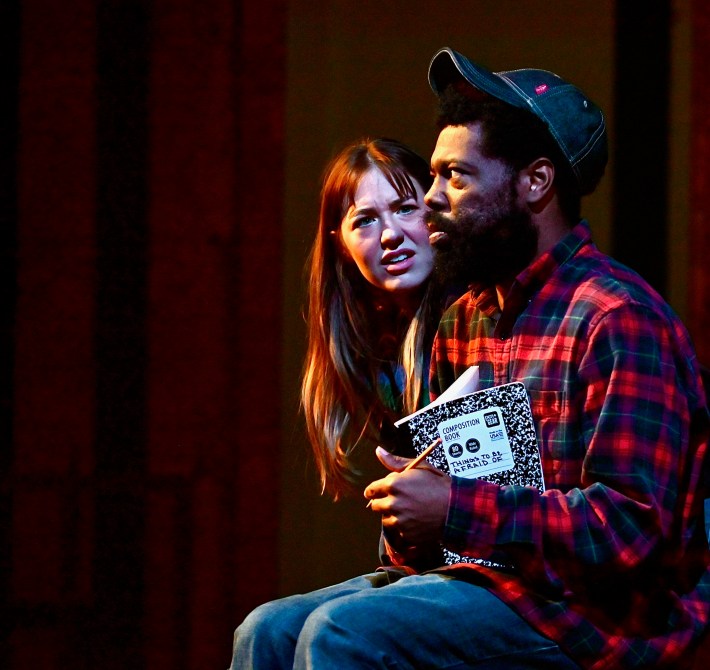 Amplifying the dreamy tone was a radiant northern lights effect designed by Anna Puhl and Finch, paired with Ben Morgan’s ethereal sound design that punctuated each scene at a specific moment. The hodge-podge set divided the stage into four separate yet distinct locations, aiding the idea that Almost is a place that isn’t a real place, though I think a more simplified, flexible design would’ve given that same effect while allowing the cast more space to move around in the light while also improving sight lines for the audience.