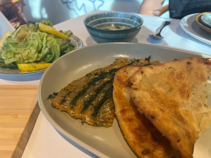 First, Smorgasbord, maybe the most easily recognizable Swedish cuisine by name and by composition. Tulsmå’s take danced around the roots of the buffet-style offering: fresh sourdough bread, rye crackers, pork sausage with juniper, and a terrine of butter with radish slices served in a portion size so opulent I insisted on keeping it with me throughout the meal, just in case. This collection of dishes established a pattern for an evening of inspiration, not mimicry, of taking a ball and running straight off the field with it. Ex: one of the board proteins was a distinctly Japanese-feeling fried smelt with yuzu that didn’t seem out of place, somehow.