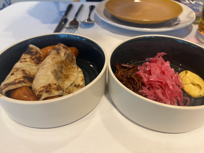 Condolences to New York City (which already has its own IKEA in Brooklyn anyway!!), because the third course, Hot Dog, was better than that one I paid $30 and traveled 1,300 miles for. The person seated across from me heard loud and clear the snap of the first bite, even as it was wrapped in a Norwegian-style potato flatbread. The condiments were a trio of plot twists, with bright pink pickled cabbage instead of standard kraut, crispy shallots instead of raw onion, and a Chinese-ish hot mustard that hurt to eat on its own but made the hot dog into something I have now devoted two paragraphs to. Even if the chef who helmed this hot dog made only hot dogs for the rest of his career—reportedly he’s one of the newer additions to the Et Al. collective—I think he might become famous.