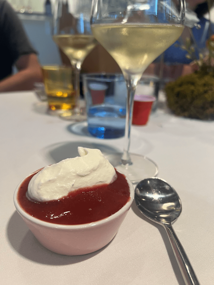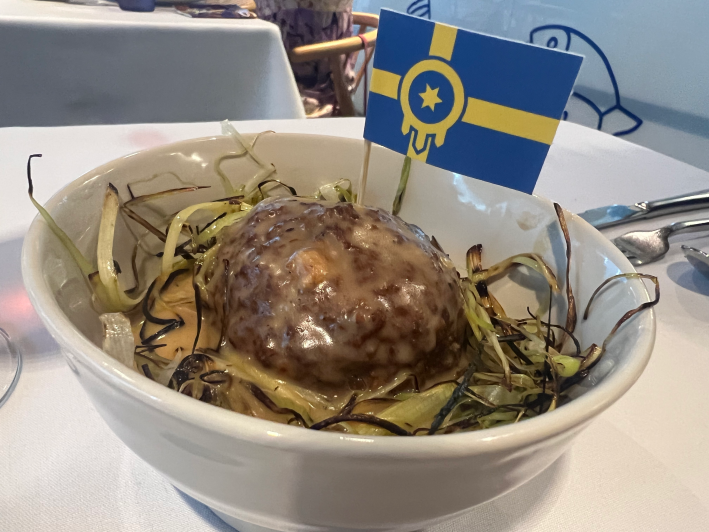 Course four, the iconic Meatball, is maybe the food thing IKEA does best. This was a drastic change in format from the gumball-sized meatballs I know (and love in context but not really outside the store because they’re just okay), with a single large meatball made of local bison and pork seated atop a potato puree and topped with frizzled leeks and Swedish “meatball sauce,” a particular cream gravy I’ve never seen on any other dish. It was the dish that came closest to the cafeteria version in flavor and style, complete with a Tulsan-Swedish flag sticking out. It was adorable and necessary for the theme, though it was difficult for me to eat several ounces of ground meat with gravy right after housing a hot dog.