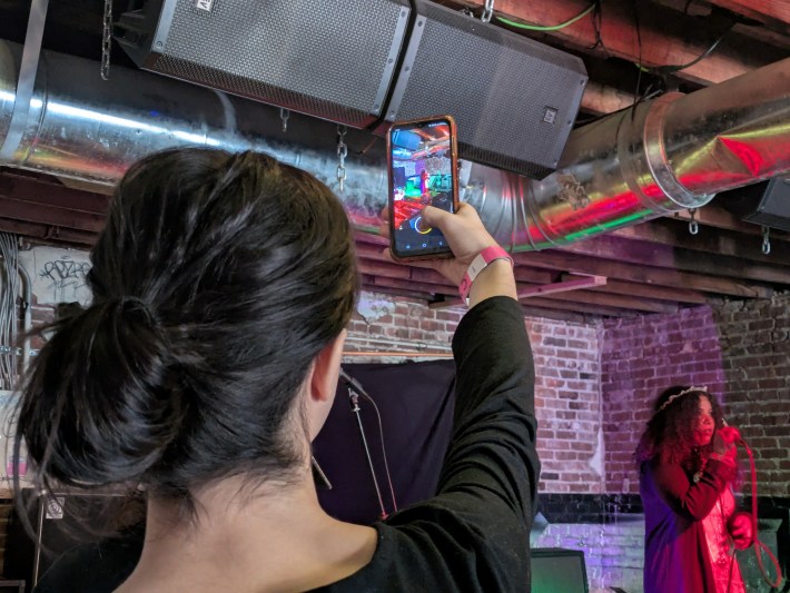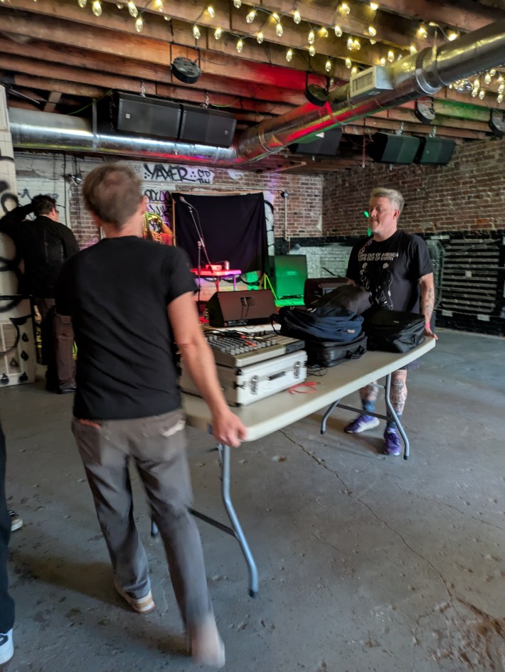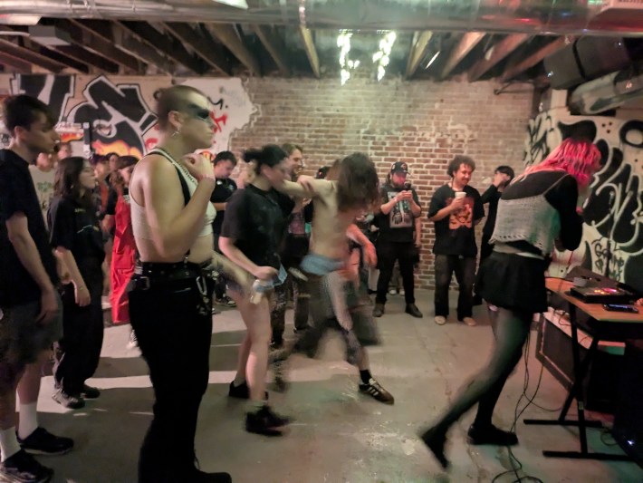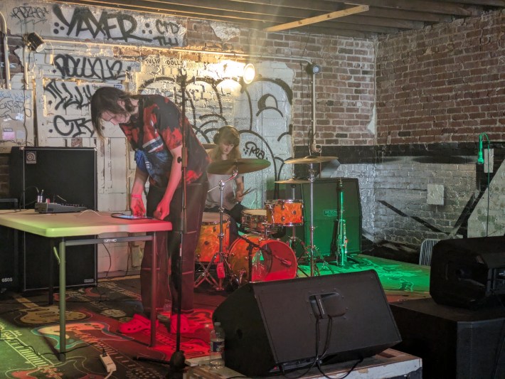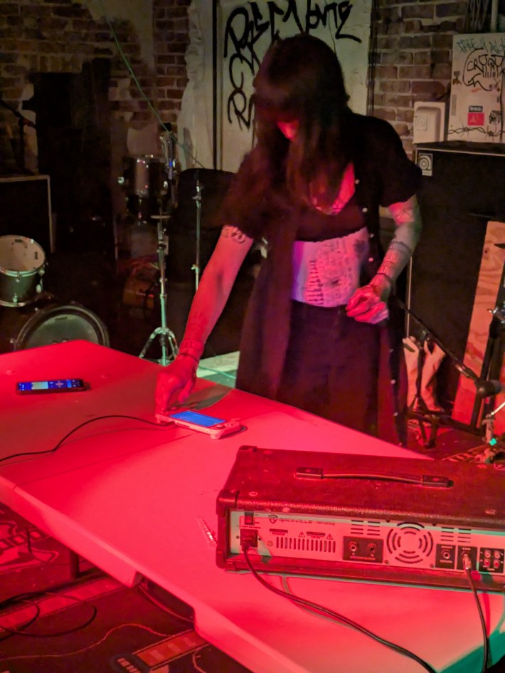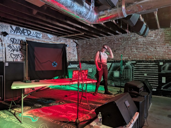 The local cyber music community turned out to hear five local acts and four touring groups at this IRL gathering, which could have been a fashion show as well as a music show. Every variation of punk through the ages was on display in the crowd, from more traditional goth and rave styles to more contemporary alt-punk/alt-goth microtrends. I overheard one person talking about their handmade distressed shirt, and another about their perfume they purchased off the TikTok shop.