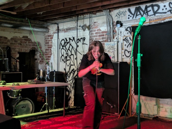 After a quick show-saving equipment run by Natty, headliner Strawberry Hospital (Texas) was ready to close out the festival. The two young musicians—with hair in their faces, skinny jeans, and equipment covered in stickers—got on stage and woke up the crowd with some of the most genre-complex music of the night. Screamo, metal, cybergrind, jungle, pop punk, post hardcore, and EDM blurred together seamlessly. The high-pitched and digitally altered vocals flying over fast-paced, chirpy synthetic backgrounds felt like a little heartbroken robot was singing its guts out. After the show, the vocalist showed me all the fun equipment and techniques they use to get the vocals to sound robotic yet organic, to mimic a vocaloid (a fully synthetic vocal software popular in Japan and underground music scenes). I think they nailed it; Hatsune Miku would have been proud.