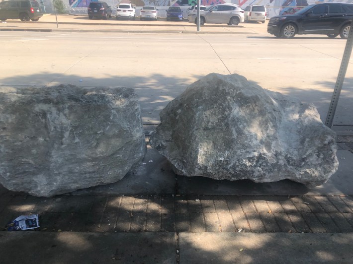 How funny. This is obviously an example—and quite an ugly one at that—of hostile architecture, which attempts to ward off homeless individuals through uncomfortable or impossible-to-enjoy benches, sidewalks, whatever—think of bird-deterrent spikes. It’s not even a veiled attempt by the City, whose statement directly links the boulders to the homeless population. Add it to the list of ways that the City is making life hard for the homeless.