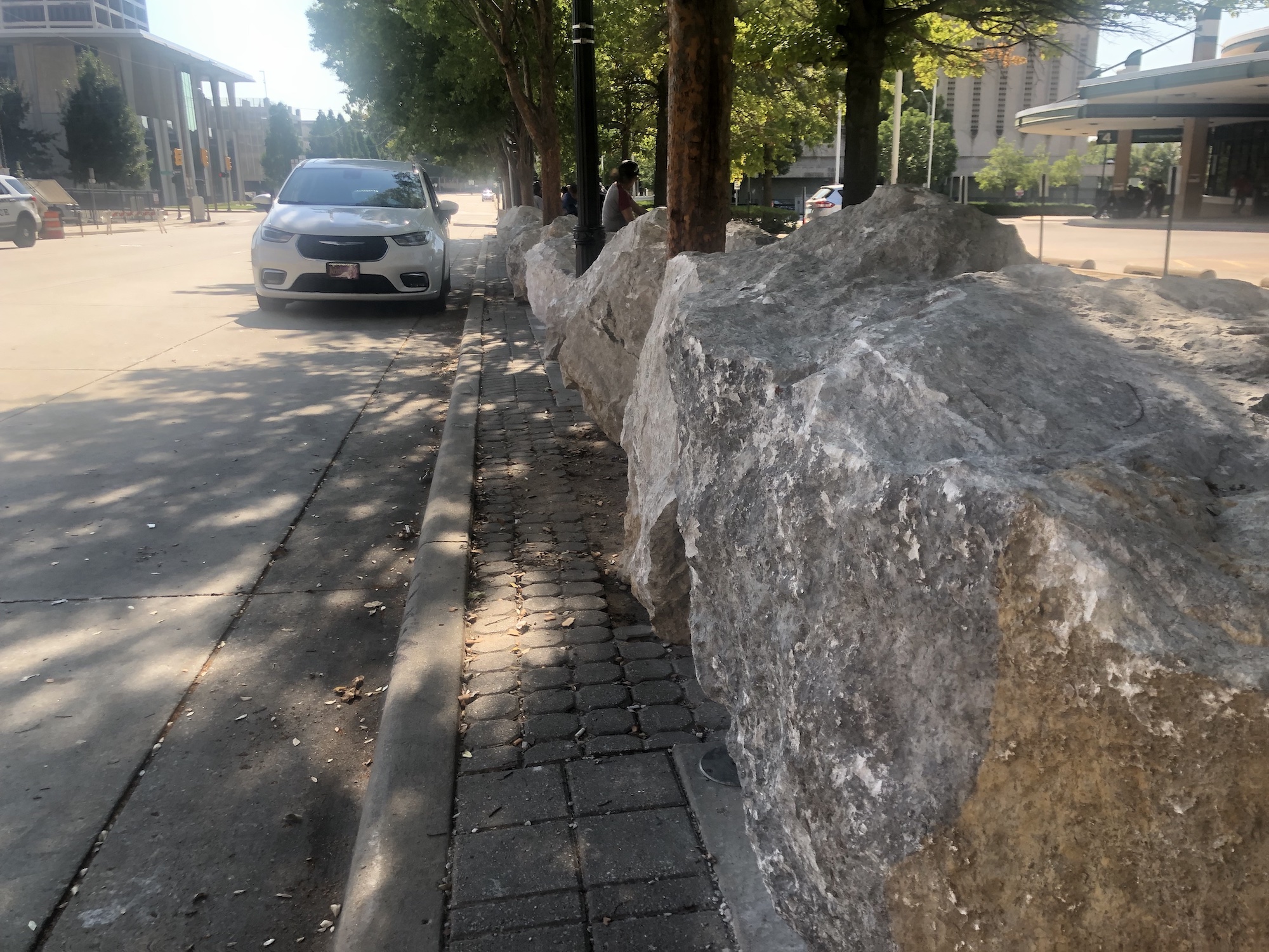 The City of Tulsa recently placed a large number of huge, jagged boulders along the sidewalk of the 4th and Denver Bus Station, one of the main hubs for Tulsa’s bus system. These boulders are linked, in the City’s statement, to the area’s homeless population, and the desire to give that population more robust services: the assumption being that, instead of hanging out on the sidewalks at this location, they could take the City’s free shuttle to BeHeard, which offers a daytime shelter, showers, and food. Additionally, and more bizarrely, the City has stated that the boulders are part of a “community art project.”