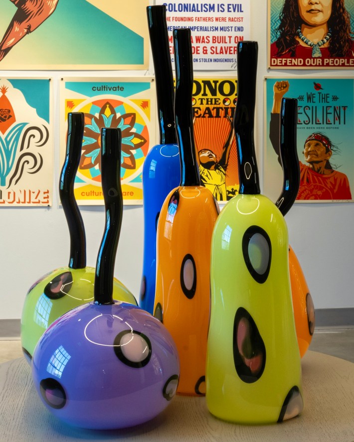 This month, TAF's open studios feature glassblower Cedric Mitchell, who returns to Tulsa with a new collection of Afro Post-Modernist blown glass wonders created at the Tacoma Museum of Glass, alongside a poster installation by Ernesto Yemena exploring the views and interactions between the Mexican communities living on both sides of the United States-Mexico border. Take your complementary Que Gusto bites and Heirloom beer to the rooftop to check out Franky Cruz's VM Dome Lab: an immersive sculpture and a living butterfly garden.