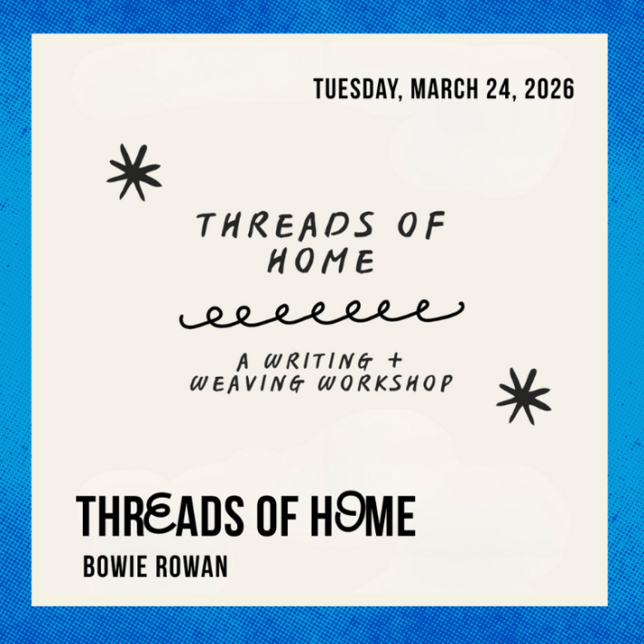 This Writing & Weaving Community Workshop is an intimate community workshop exploring ideas of home, belonging and connection through writing and fiber art. Participants begin with gentle, generative writing prompts, then translate words and memories into a hands-on weaving practice using small looms. This process-focused gathering centers play, presence and connection over perfection. No experience is required. All materials are provided, and participants will take their loom home.