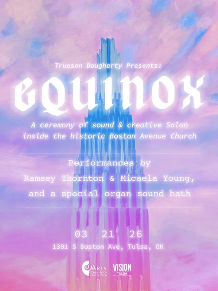 In this one-day-only experience, Trueson Daugherty brings the spirit of his home-based creative gatherings at The Parlour to one of Tulsa’s great architectural and spiritual spaces to celebrate the spring equinox. The day will begin with a creative salon, followed by performances from Ramsey Thornton and Micaela Young, culminating in a full organ sound bath, allowing the building itself to become the instrument.
