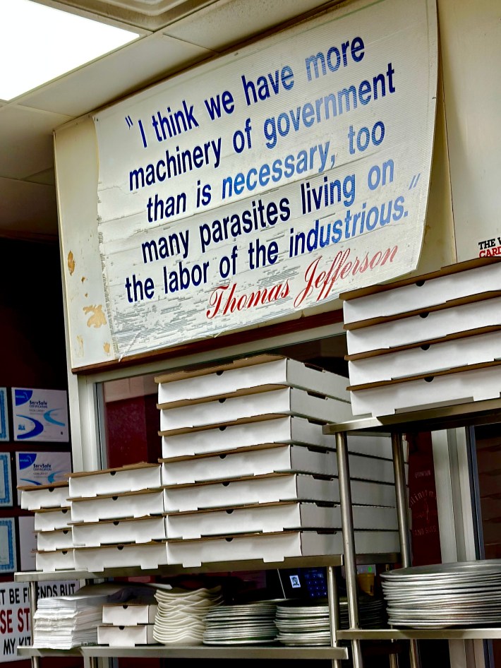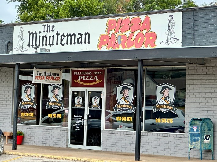 The Minuteman Pizza Parlor tips its tricorne hat to the Sand Springs school district’s mascot and never once breaks character. This place is a full-on colonial fever dream: Founding Father quotes on the walls, patriotic signage, dad jokes in suspiciously Comic Sans-like fonts.