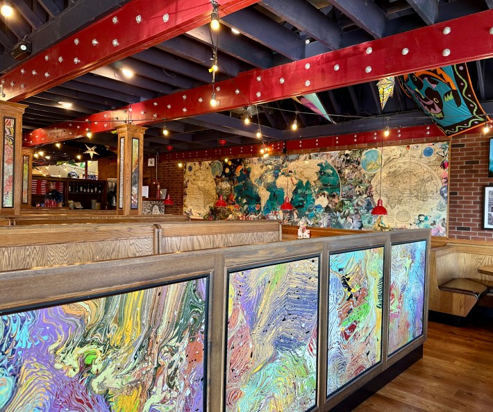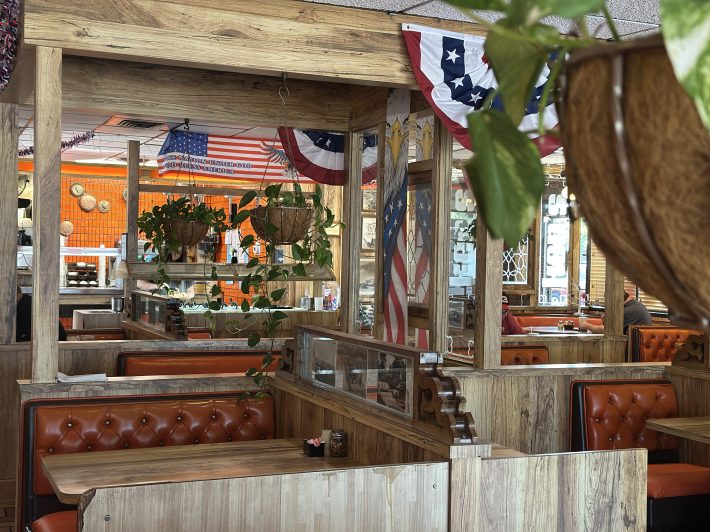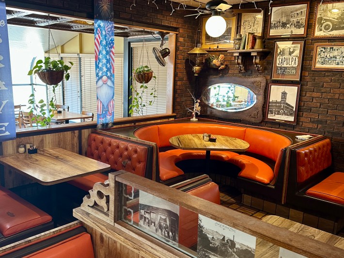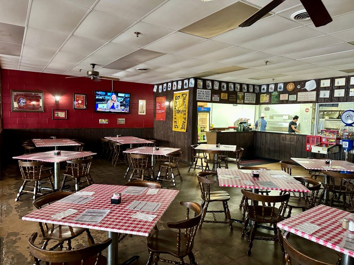 Inside, you’ll find gingham tables, gumball machines, huge booths, and a vibe that screams “childhood birthday party with a side of libertarianism.” FOX News might be playing on one of the TVs, but the energy is more grandpa’s garage than political rally. It’s a multigenerational hangout spot. When I visited, the back party room had just wrapped a Chamber of Commerce meeting.