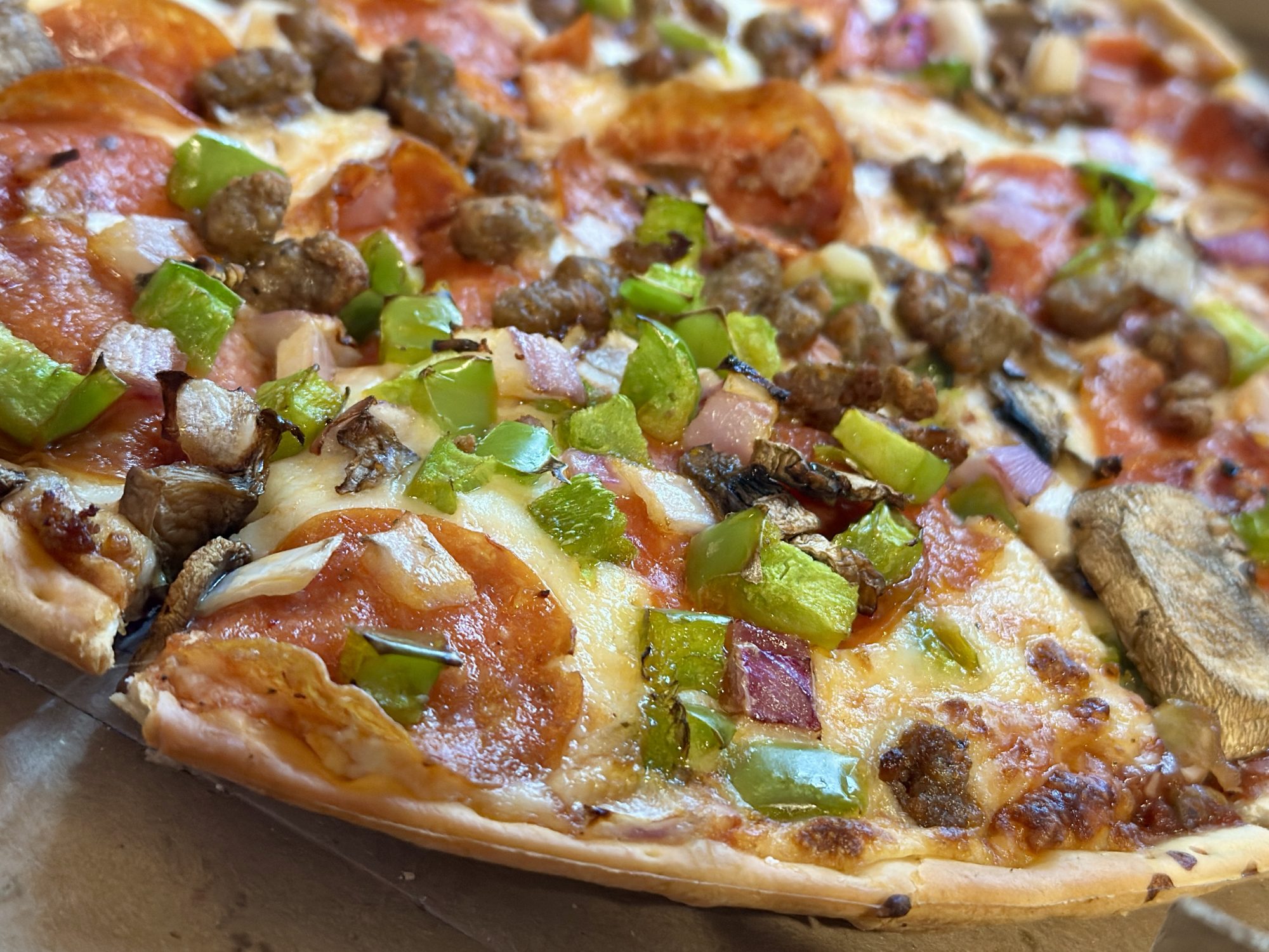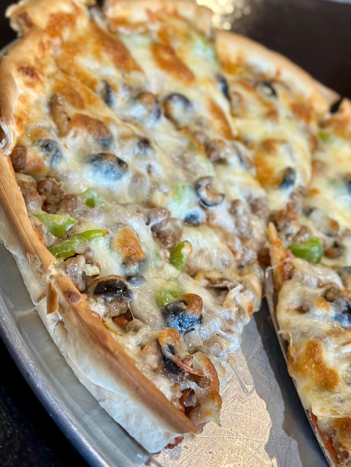 And the pizza? Legit. Crust is A++ top-tier—lacquered with a deep crisp, it reheats like a leftover dream. My friend who alerted me to this place years ago led the charge on the order with several toppings (medium create your own $16.99, $1.99 veggies, $2.49 meats). The sausage and hamburger were plump and savory, the mushrooms had bounce (important), and the olives weren’t squishy. This is a cheese-on-top setup and the result is gorgeous. The only hitch is the sauce—it’s sweet. Like, sweet-sweet. But toss on some jalapeños or pepperoni and it may find its footing.