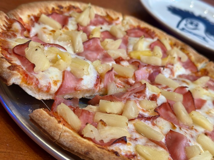 Hideaway was one of my final stops on my journey, and I went rogue: I ordered a small ($13.39) Canadian bacon and pineapple pizza on the thinnest crust they offered. Judge me if you must, but I regret nothing. Hideaway is a toppings-on-top outfit, and the gods approve. The Canadian bacon crisped at the edges, the pineapple held its shape and sweetness, and the sauce? Mellow on the couch, chill AF. The crust is … different. Still thin. Still crisp. But there’s something pillowy about it. You expect a shatter and get a snuggle.