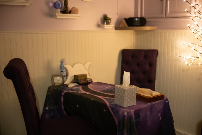 Amber takes me into a small mood-lit room for our reading. I ask if I can record our session. She quickly agrees. I can see Amber being somebody the dead might want to communicate through. She’s warm and laughs easily. There’s no pretense or gloomy atmosphere. We’re here to talk to the dead, but that doesn’t have to be a sad thing, baby girl! Amber uses well-worn tarot cards and says she also “gets her visions like in old movies.”