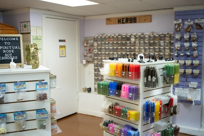 I call the intrepid Kathryn Parkman to see if she’ll go to east Tulsa’s Botánica with me instead. I found this place by Googling “Santería near me.” I was raised Catholic but later became curious about religions like Santería and Hoodoo that melded their beliefs to Catholicism to preserve Indigenous traditions. In those religions, saints (adapted polytheistic gods) dispense favors, protection, or blessings in return for tangible gifts like whiskey, money, or cigars. Ceremony is the key. I want to do as many ceremonies as possible, but I’m on a budget and Miss no-show Lauren just cost me $66.66.