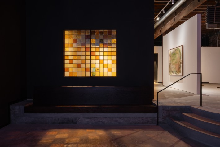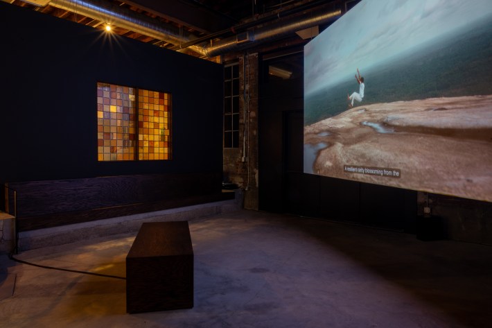 The sunken space where the video is projected is flanked by A soft place to land, a sculptural reference to a line LeSeur writes and speaks within Monument Eternal: the idea that her own body—held, worn, tested—is that soft place. These mouth-blown amber stained-glass windows contain the viewer in a warm atmospheric envelope. They cast clouded, umber light across the gallery floor opposite the video. The light is filtered and softened, unmistakably separate from the outside world; entering this space feels like crossing into an interior terrain where attention heightens and the air behaves differently.