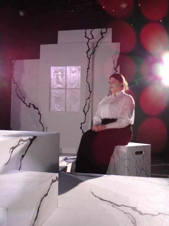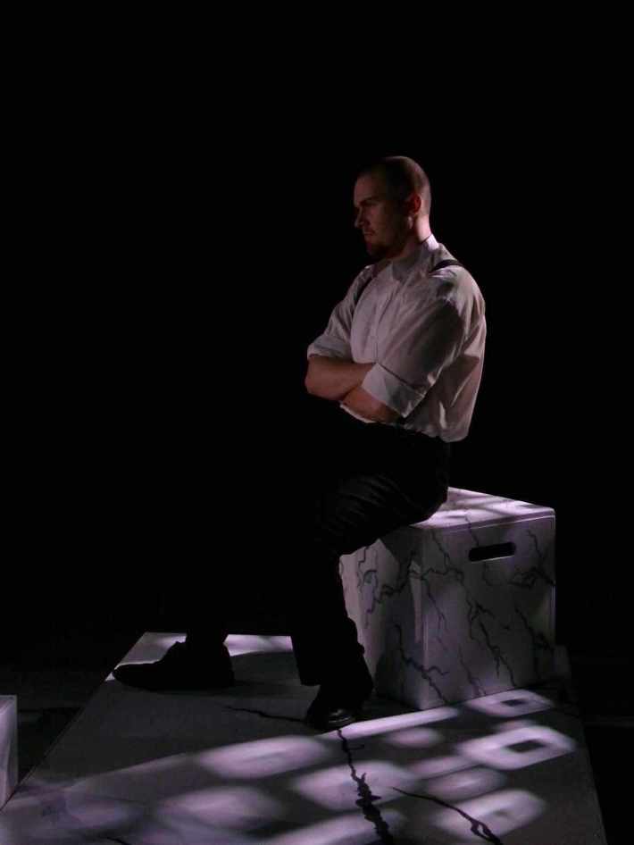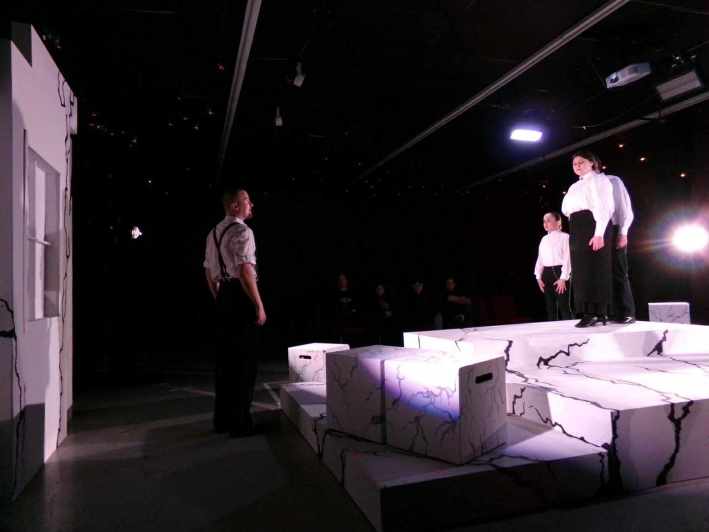Constructed so that audience members sat on two opposing ends of the stage, the set was almost abstract. Large blocky platforms of different heights and widths created multiple levels. Two small walls, one with a window, were placed on the sides of the stage that didn’t have audience members. All set pieces were coated in white with stark, jagged black cracks, alluding to the immense pressure the group feels to pull off the assassination and how that pressure could be affecting their mental state.