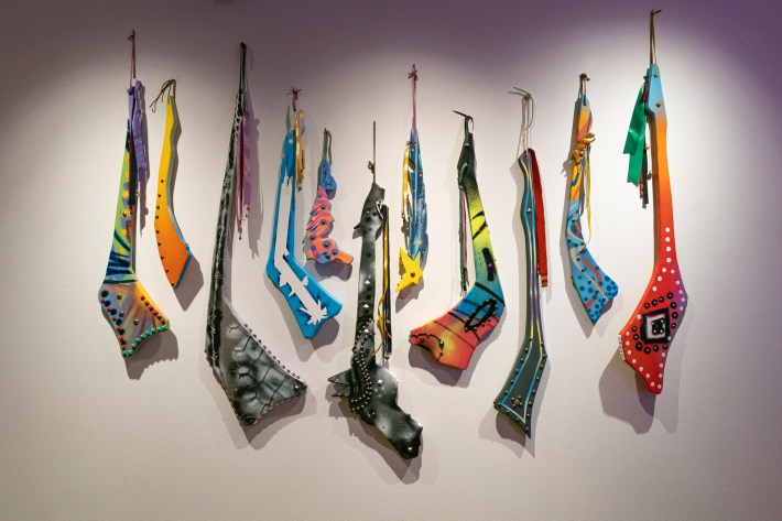 In the West End gallery, Tulsa painter Austin Gober asks a different set of questions: about absurdity, ambiguity, and celebration, proposing to “take the meaning and purpose out of familiar objects and turn them into flat, unnatural entities, and … take flat, meaningless shapes and compose them into familiar forms.”