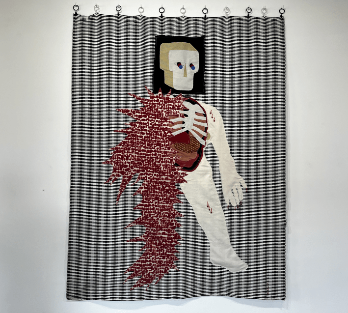 Most of the pieces in Meat Engine are done on wood panel, with materials like acrylic, house paint, graphite, and flashe (a vinyl paint) which Beedallo uses with a sure hand. The two exceptions—“All the Ways You Will Fail Me,” a large piece made with recycled upholstery fabric, and “The Same But Different,” a terrifying rapid-fire video collage from an oral pathology book—are standouts that speak to the range this artist has to explore.