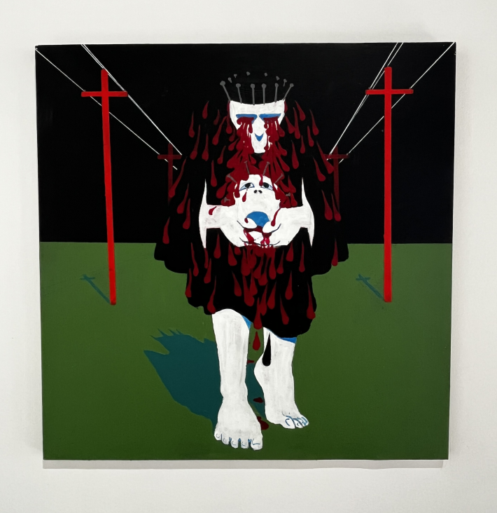 Nearby, in “Holding My Head In My Hands,” a giant barefoot figure does exactly what the Amelia Bedelia-ish title says. Both heads are crowned with nails, and their eyes gaze at each other as they seep and weep drops of blood, framed by cross-shaped telephone poles whose lines squeeze in at sharp angles toward a distant vanishing point.