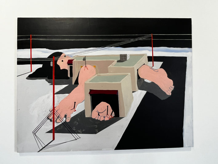 The stark red power line posts and black skies in some paintings suggest an environment that’s not built for humans (i.e., with their wellbeing in mind), but literally built around them. In “This Neighborhood Kinda Sucks,” a nondescript, puke-colored warehouse or segment of strip mall contains the giant, inert, salmon-pink body of what might be a child, whose limbs and head bulge out from the building’s orifices. A lightpost pokes up through their arm, and a rooftop A/C unit sits just level with their button-black eyes. Guy wires and their shadows make a weird non-Euclidean shape on the snow-covered parking lot; even the non-flesh bits of this scene look uncomfortable, yet somehow at rest.