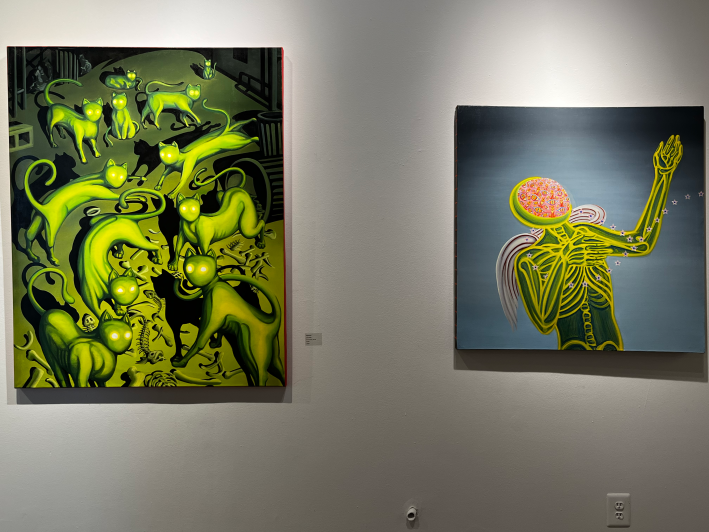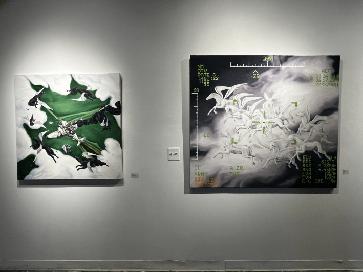 After the murky, pulsing, liminal flow of “Without the Divine,” these paintings made me both shudder and laugh. With decisive brushstrokes, extreme perspectives, and a confident use of unexpected color, Bolth gives us a fleet of white pegasi seen through a bombsight; a flying circle of black dogs looking down on a disemboweled Cessna; a crowd of fluorescent cats in an alley, eyes glowing with nighttime light; a green-masked dog pausing in mid-crotch-lick; an alien dunking a basketball on a court with industrial smokestacks in the background; crows perched on playground equipment, lit by a black, kidney-shaped sun. The water in this world is radioactive, bright orange; the skies are on fire; threats of exposure, entrapment, and attack are everywhere. The cultural and historical artifacts Bolth uses speak to a legacy of death—with that as our heritage, it’s no wonder that what lives best in this space is surreal, both hilarious and psychotic.