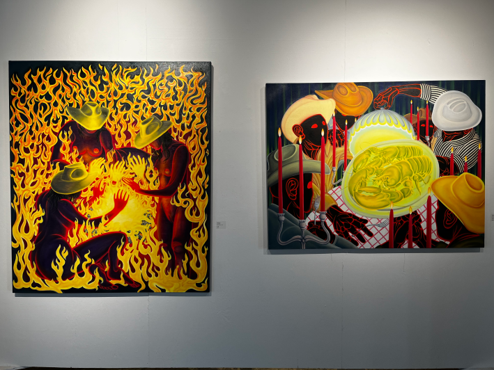 The human forms in Bolth’s paintings are almost all faceless: red skeletons filled with beefy black, eye sockets glowing scarlet. They look less hollowed out than about to overflow with dark goo. Some are got up as cowboys; others are accompanied by elements associated with global Indigenous cultures. Maybe the strongest piece in the show, “Big Wheel,” puts a group of those shadow cowboys, guns drawn, on five panicked carousel horses, whose muscles swirl like the whorls in the cowboys’ clothes. Mirrors behind the figures make it hard to be sure who’s aiming at whom—a moment of total raging mania, frozen in bizarre, circusy fun-time. You can almost hear the carousel music going haywire on this ride from hell.