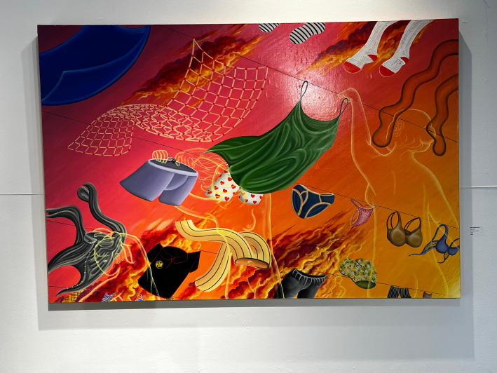 Walking through black curtains into the second exhibit in this show was like moving into another planetary atmosphere: scorching sun and wind rather than liquid and earth, masculine rather than feminine. But the visions here, in Josiah Bolth’s “Twilight Language,” complement Maday’s work in their phantasmagoric chaos. Bolth is a New Orleans-based oil painter who seeks, as he says, “the creation of a figurative space replete with the artifacts of culture and history, of disorganized and unfocused consciousness, murmuring with the promise of stranger forms waiting to be conceived.” As with most artspeak (Maday’s, too), all of those words say less than the work itself, which mashes up many myths and totems against the backdrop of a terrifying present.