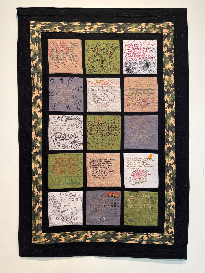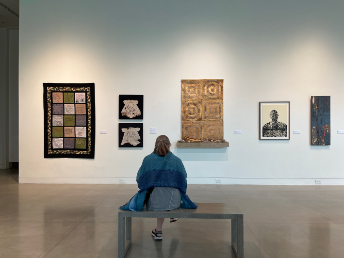 A bench sits in the middle of the space, with some of those pieces plus Jane Sauer’s hand-stitched quilt (“Ravages of War”) and torn, burned baby dresses (“Why???” and “Collateral Damage”) on one side, and Hunter’s “Biography” on the other. Sitting on that bench, you rest in the center of some very tender human concerns, and the natural and the psychological shift into the overtly political as you move further into the show.
