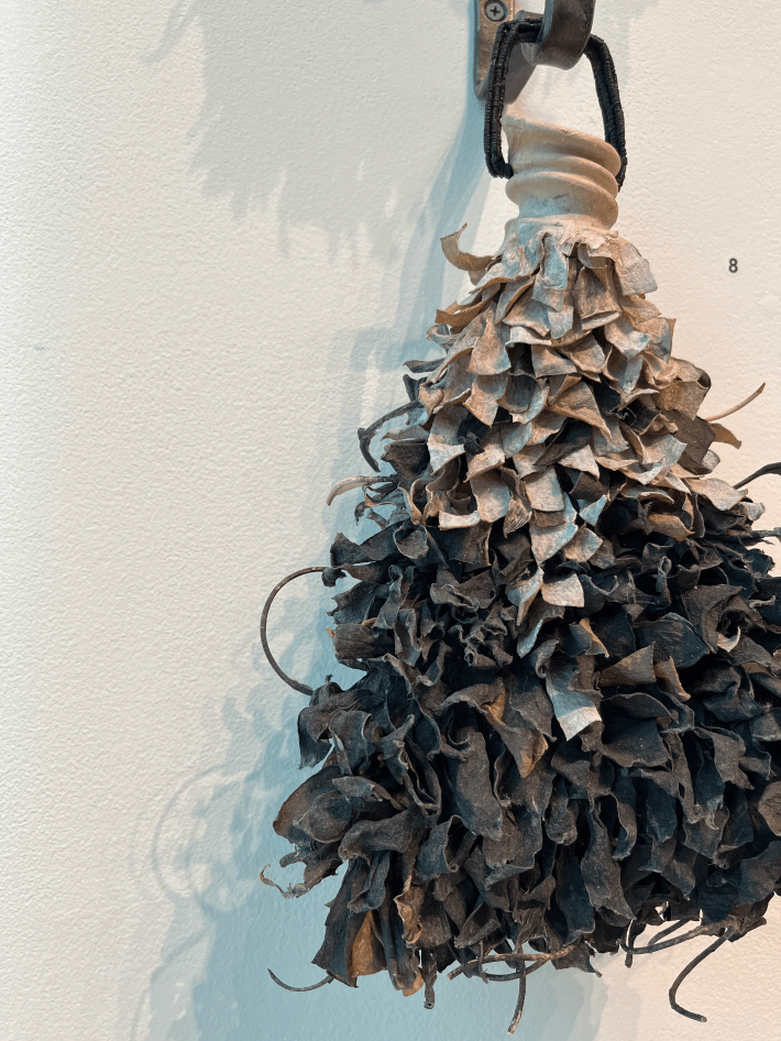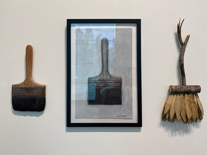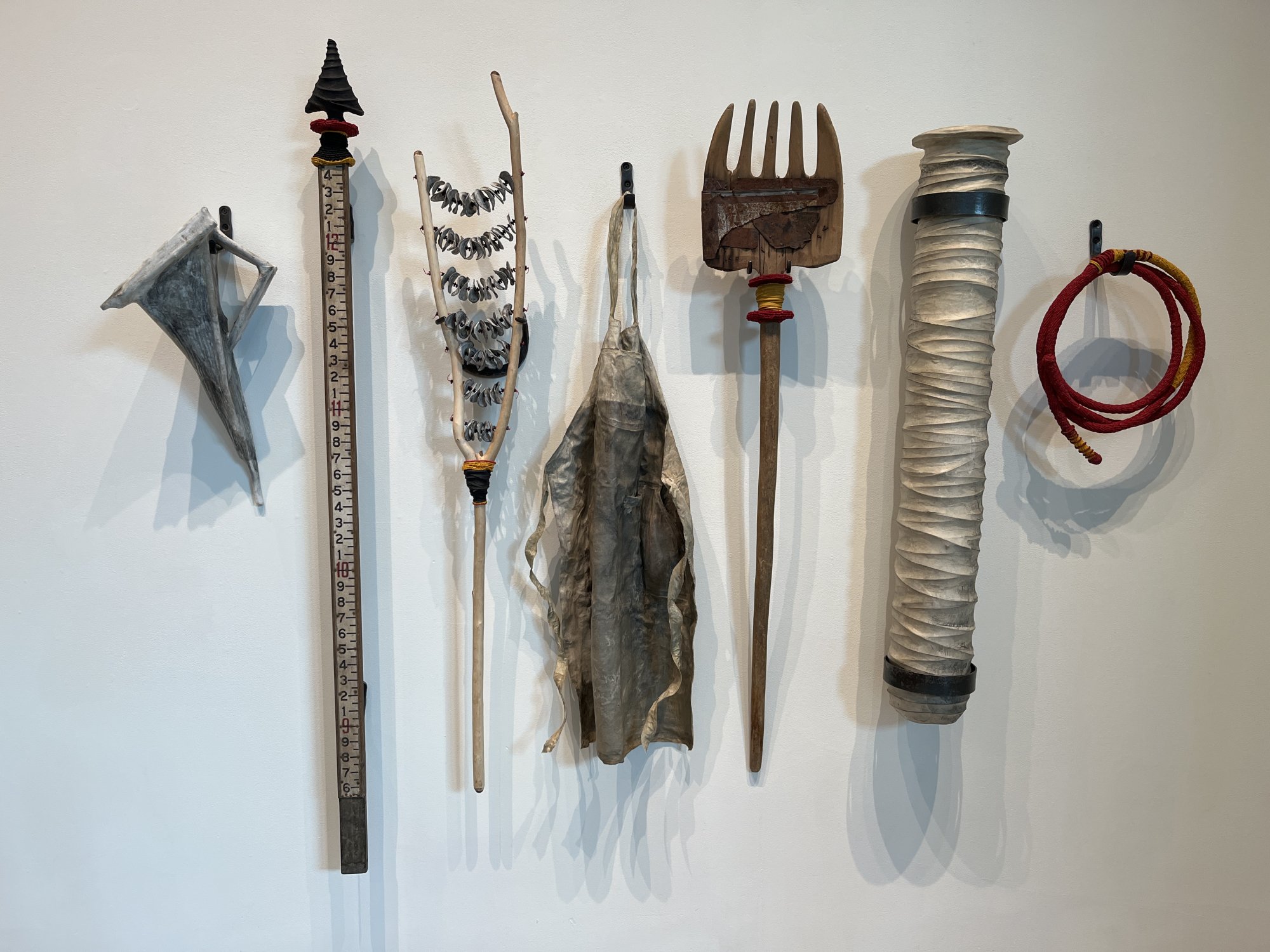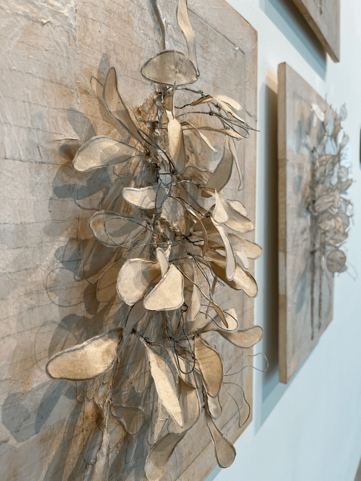 There’s humor here, too—in Stealey’s set of “Tools of Suspect Origin,” which whimsically reimagine familiar forms; in Hunter’s trompe l’oeil dishware, her trio of brushes, and her wire-and-paper branches; and in Stealey’s wonderful “Weights and Measures" (seen at the top of this post), a set of slightly improbable life-sized tools from some slightly off-kilter shed, which you could easily walk up and take down from the wall for some unknown use (don’t do that, though).