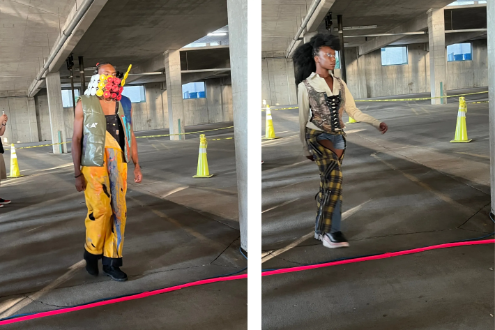 That got meta pretty fast, I know. But the longer I stood (dripping with sweat, gratefully slurping a strawberry mango ice pop from the Frios truck outside) in the concrete bunker of the 1st and Boulder parking garage during the underground runway event that popped up there last Thursday, the more questions like that—from the immediate to the sociopolitical—kept rising up and hanging together as casually-slash-intentionally as some of the garments on view.