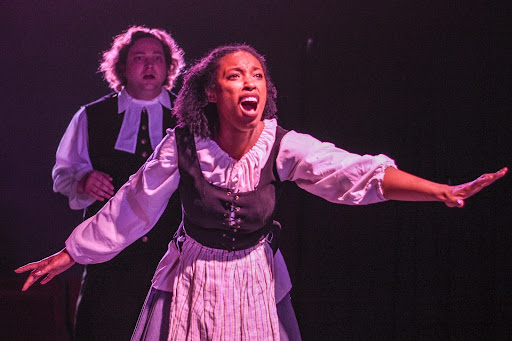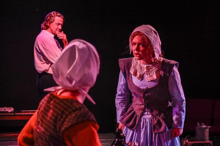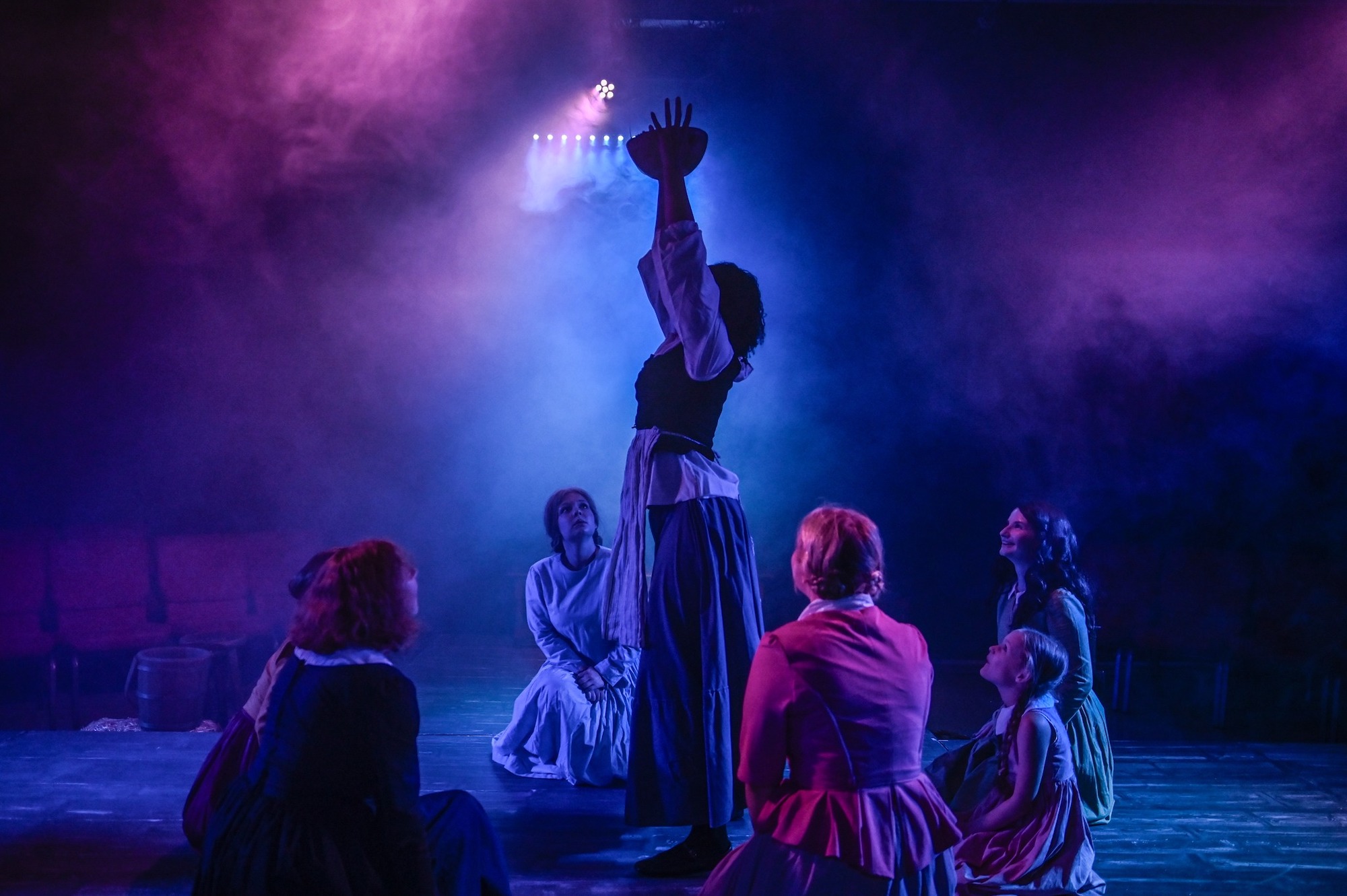 The most gripping moments involve Fletcher Gross as John Proctor, Meagan Mulgrew as Proctor’s wife Elizabeth, and Prudence Lloyd as Abigail, especially in scenes following Proctor’s infidelity and its impact on the two women. Whenever Gross and Lloyd were alone on stage, I felt like I should leave the room, so strong was their chemistry. Gross and Mulgrew have a different energy: while their characters appropriately start the show completely disconnected, their last moment together, at the climax of the drama, finds them totally, physically in sync.
