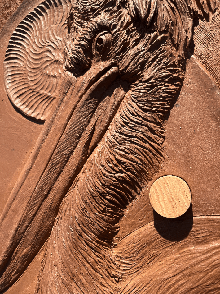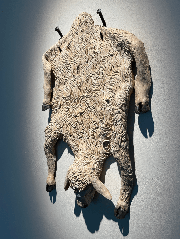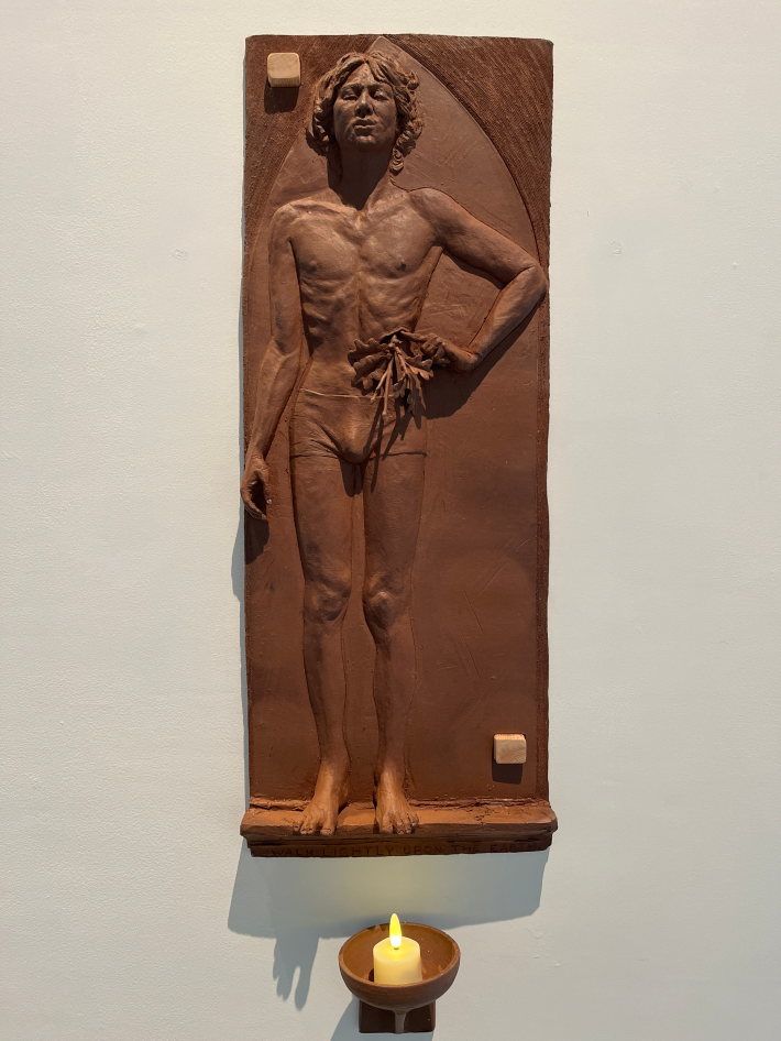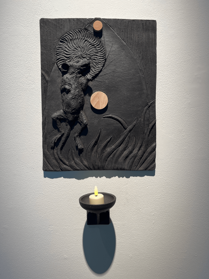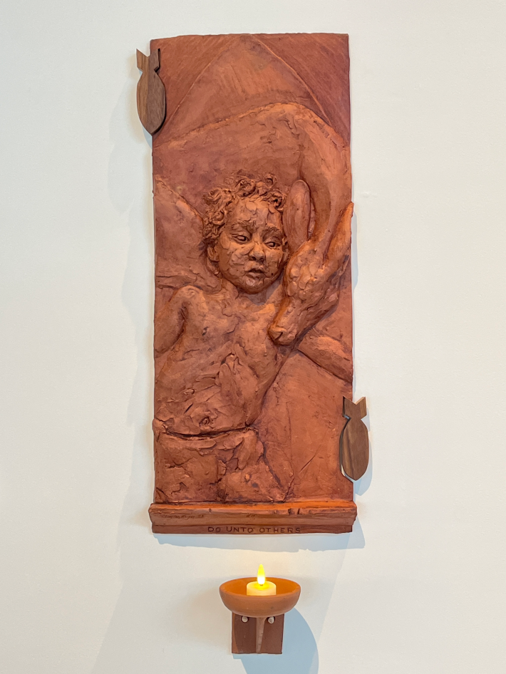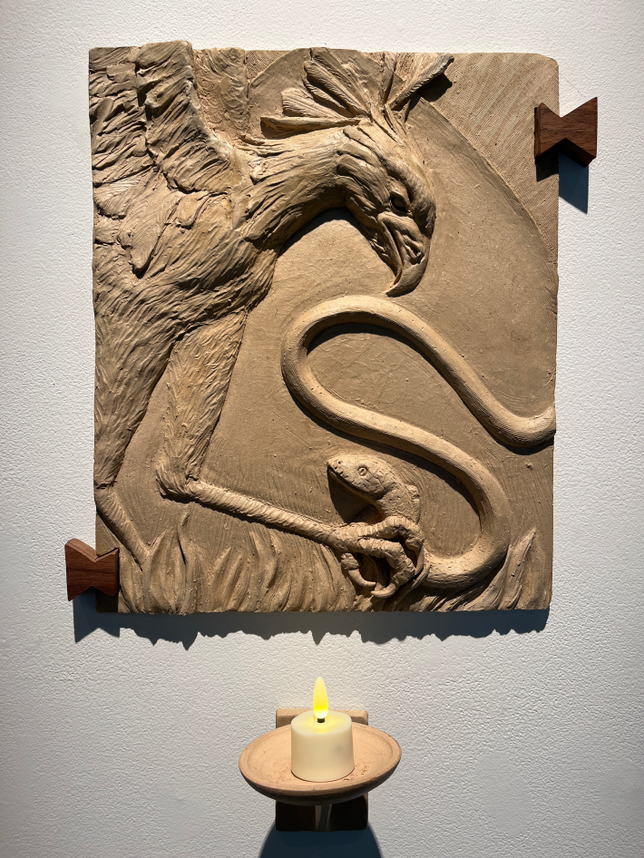 The deliciously unsettling power of Keyes’ work comes in its exposure of the ways in which polarities—good and evil, preservation and decay, the sinister and the precious—often dwell together. Two icons flanked the entrance to the show, setting a gentle yet ominous tone: an infant and a baby deer resting together (“Do Unto Others”), and a young man holding open a gash in his side from which oak leaves and acorns emerged (“Walk Lightly”). Along one wall, a series of panels (“Casual-ties”) hovered over candles like Stations of the Cross—a dead mouse with one paw extending from the panel’s surface, haloed with a whorled roundel; an eagle grasping a snake in its talons; an exquisitely detailed pelican—each punctuated with dowels or jointures whose wood grain made a beautiful counterpoint to the rough clay surfaces. These entrance panels and stations, like the ones in a Catholic church, served as focal points for meditation, inviting viewers to consider the twinned realities of vitality and violence, softness and savagery.