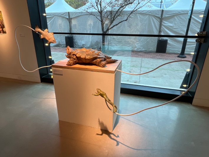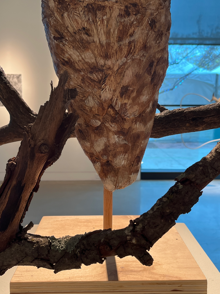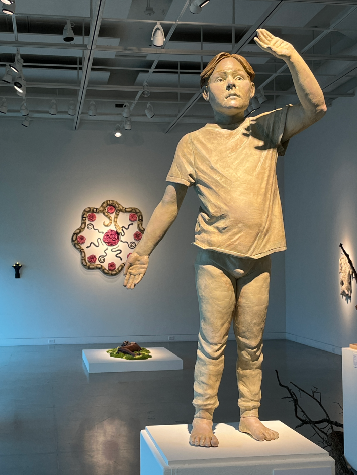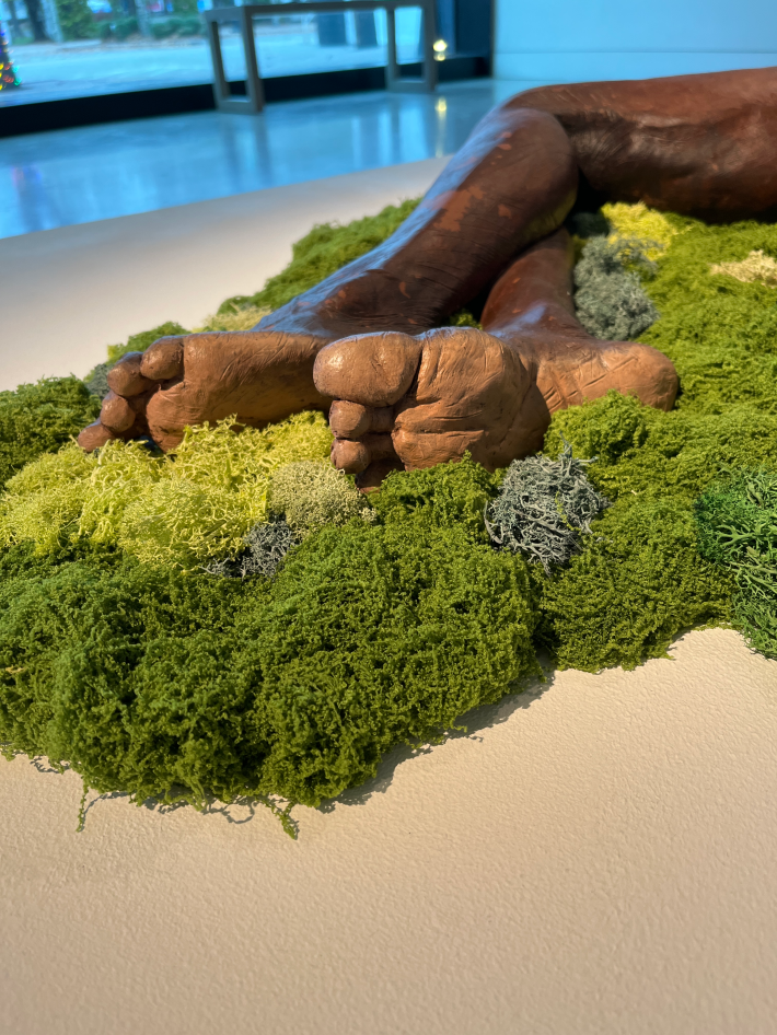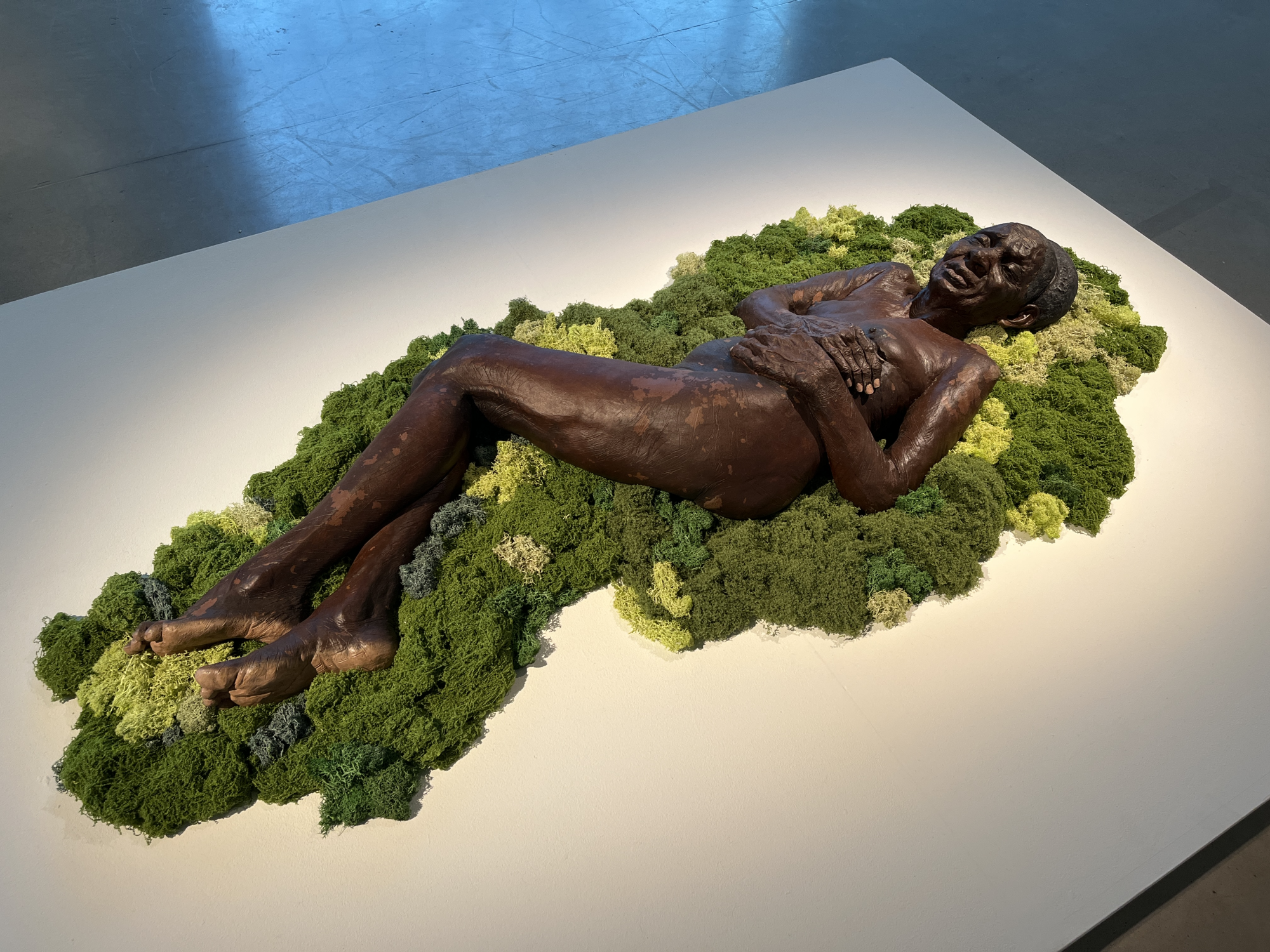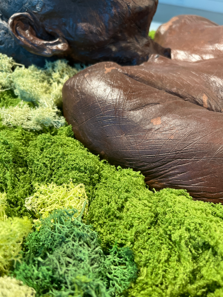 Far behind this boy lay a figure called “Mitochondrial Mother” on a vivid green bed of moss, her skin literally weathered; after sculpting her, Keyes placed her on some friends’ land for several months, and photographs from the weathering process were also part of the exhibition. What does she remember of how humanity has devastated the earth, even as her own body becomes part of it? Far from being coldly conceptual or cringily on-the-nose, this piece and the others in Subterfuge drew the viewer into the realm of flesh and root and bone—into ancient and very present elements that demand our honor.