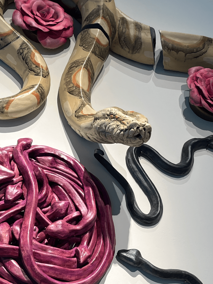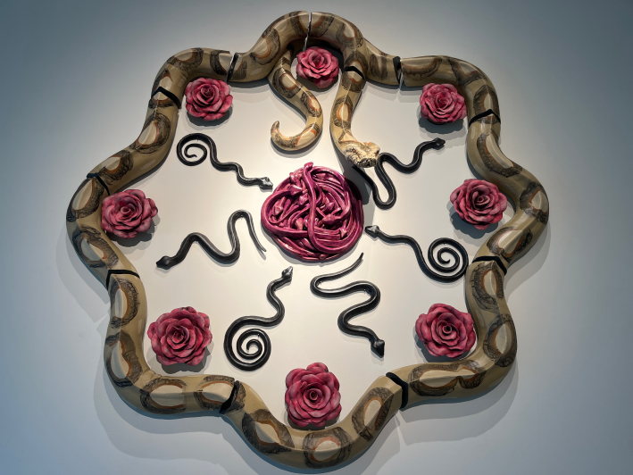 I wanted to bury my face in the curls of the sculpted lamb’s pelt hanging next to this figure, but could not: it had been sacrificed, splayed head-down on the wall with iron hooks, plus its title (“Pull the Wool and Follow the Leader”) served as a warning. As in most of the works in Subterfuge, many archetypes and art-historical references coursed through this piece, from the Lamb of God to the Golden Fleece, and I enjoyed letting them flood my brain as I stood in front of it. Similarly, the snakes coiling within and around the familiar shape of a rose window—a hallmark of Gothic religious architecture—sent out a plume of suggestions: the sinister note lurking within a symbol of divine order, the promise of regeneration, the luxurious beauty of nature, the venom that waits to kill.