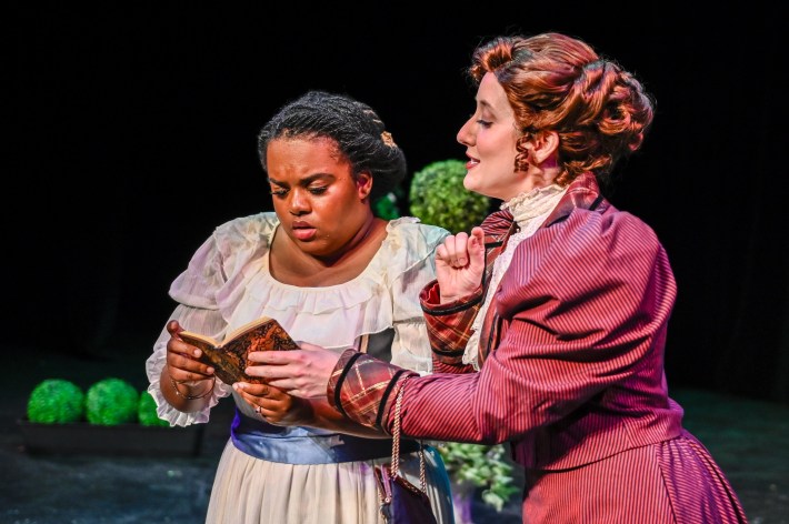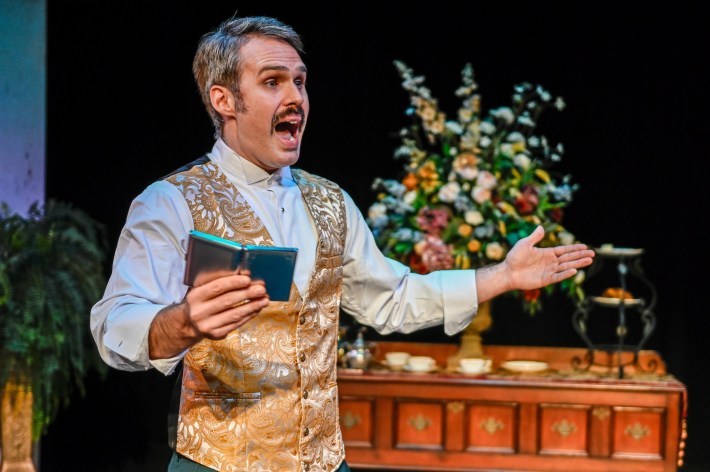 This decadence extends to other areas of the production, like Pax Zeller’s uppercrust Victorian costumes. I’d never thought to pair dark periwinkle and mint green for an outfit, but I couldn’t look away from it. It was easy to see how the costumes reflected each character’s inner journey. For example, when in the city, and pretending to be another man, Damien Hartzell (in the role of Jack Worthing) is dressed almost entirely in black. But, when the play shifts locations to the country, where Jack does not lie about his identity, his clothes become more colorful. These costumes’ visual boldness emboldens the performances. The choice to play classical covers of pop music before the show and during both intermissions feels pointed, too. While some may roll their eyes at songs like these, I think a string quartet cover of “Uptown Funk” and “Bad Romance” is exactly Wilde’s brand of camp.