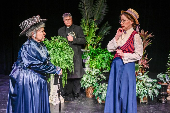 Sirois deftly directs a well-balanced cast, creating chemistry in duos. Jarrod Kopp and Jennifer Ann White are hilariously in sync as Reverend Chasuble and Miss Prism. Hartzell and Jasper Hammer (who plays Jack’s friend Algernon Moncrieff) are delightful foils. While Hartzell is rather restrained in the first act, the humor of his character leaks through his bold facial expressions. He opens up as the play proceeds, becoming more physically ridiculous like his friend.