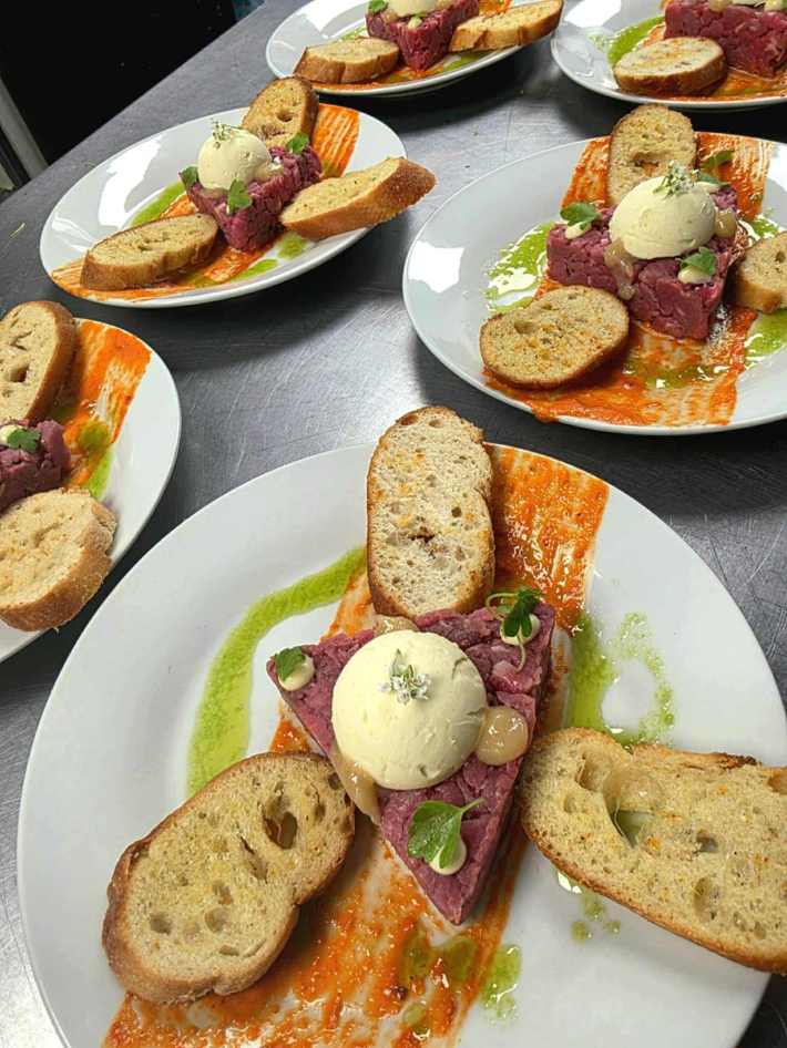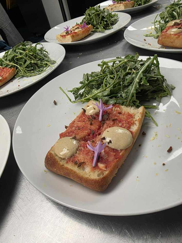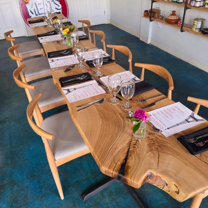 Now, they’re leaning into a rhythm: a themed menu offered each Friday (the theme changes each month), a vegan dinner one Saturday per month, and an à la carte brunch every other Sunday, plus the occasional Saturday brunch if catering doesn’t pull them away. They also do the occasional “Winesday”—more casual three-course wine pairing popups throughout the month.