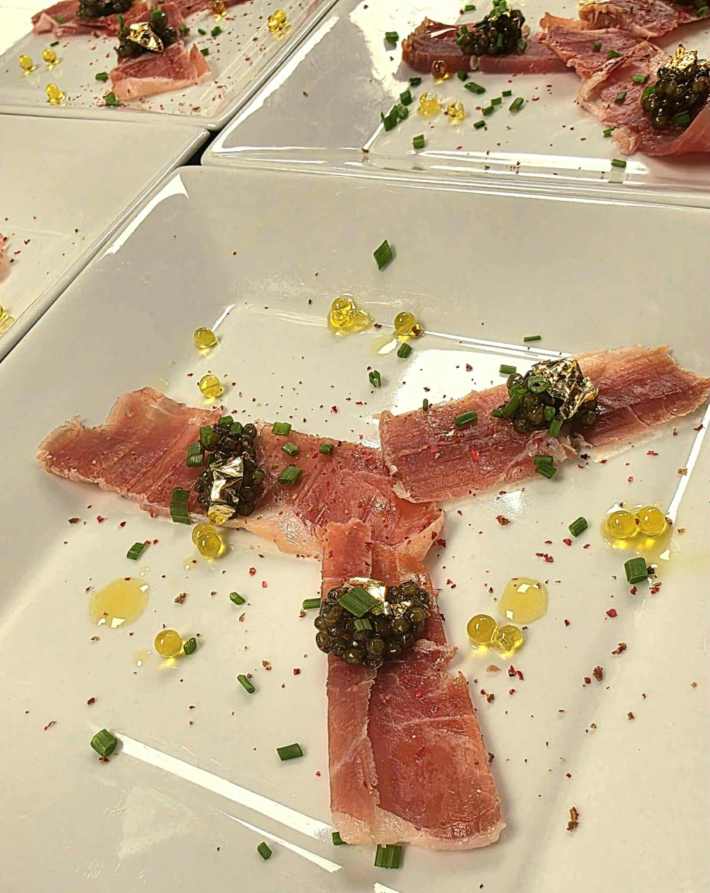 Bite two—jamón ibérico with caviar and gold leaf—kept the wonders coming. I’d never had caviar before—let alone topped with gold. The words “Poseidon’s capers” floated into my mind as the rare roe channeled the salinity of the green buds; when I said this out loud, Bein pondered and replied, “That’s exactly what it is.” The Jamón Ibérico (a recurring ingredient throughout the evening) was served in thin slices that carried deep, rich flavor. The dish was capped with ingenious olive oil “pearls”—a sort of micro-Mediterranean boba that popped in your mouth and washed over the salt and fat.