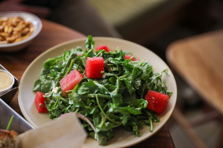 Alicia: If you’re dealing with the potato chip tower and the burger and the pimento sandwich, you need the salad to cut through with a little complexity. It does that really nicely. So I’m very keen on the watermelon salad as my number one.