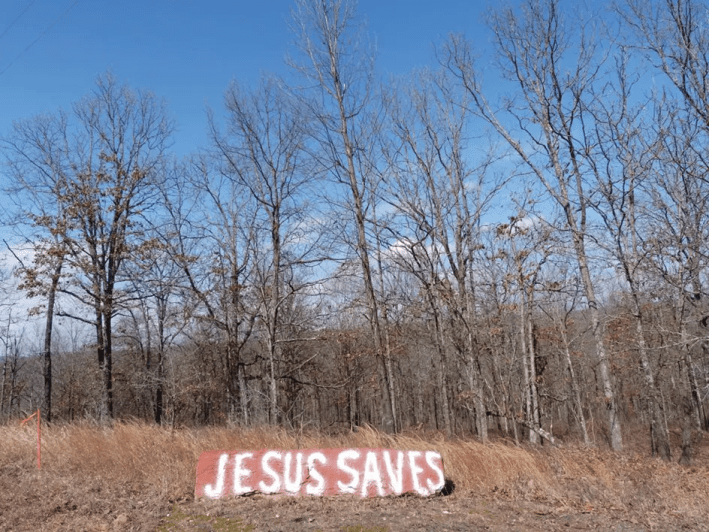 After the tour, we say our goodbyes and Millar leaves us to find our own way out. With its residents all gathered for service, Elohim City is a ghost town. The air is still and peaceful. The warmth of the sun, the soothing hum of the natural ambience, the majestic view of the Arkansas wilderness—in this moment, it’s obvious why these people are here. On the way out, we notice a primitive, white sign mounted on the side of the road, adorned with a bright red spray-painted phrase: “Jesus Saves.”