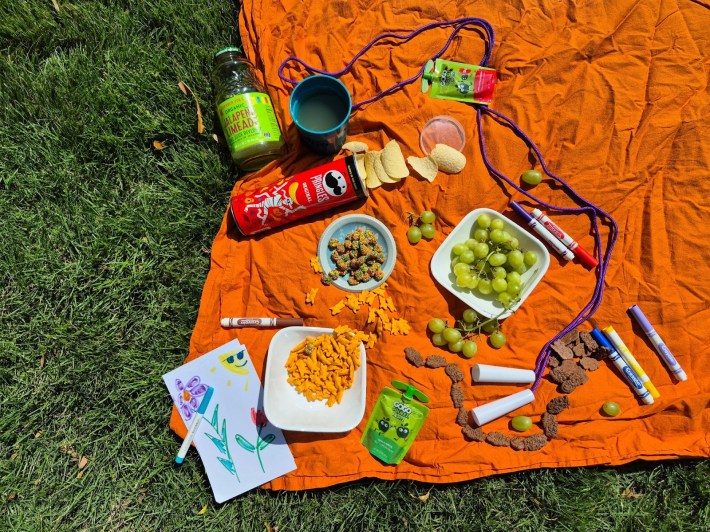 The key to a satisfying childhood-themed picnic is not working too hard at the preparation. Buy pre-packaged single-serving snacks, don’t wash your fruit (you’ll be fine, I promise), and commit to a relaxed hang without an important meeting you have to rush to after, so you can fully be present.