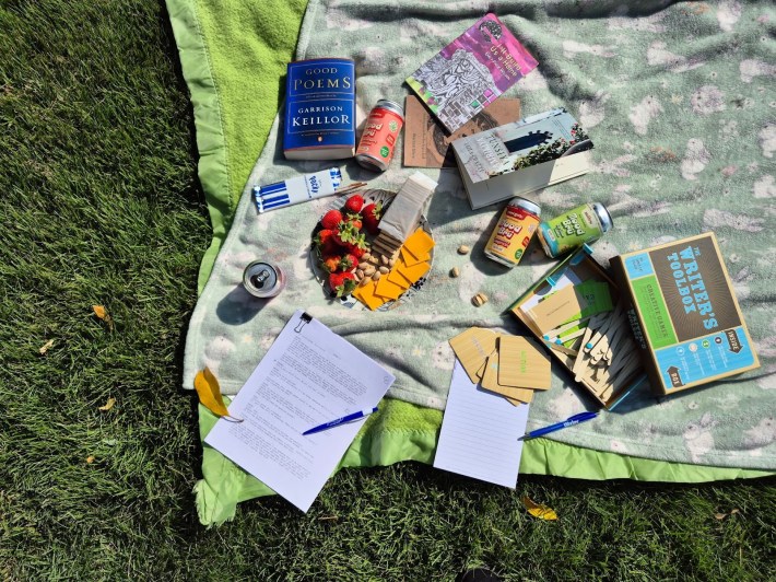 In The Picnic Basket: Whatever gets your creative juices flowing, but I’d recommend foods that are easy to eat one-handed while you page through a book, or to mix and match creatively. Think charcuterie board staples like cheese, crackers, dried fruits, olives, pickles, mustard, pretzels, and chocolate. Toss in a few cans of the Creative, Focus, and Elevate Mood Brü flavors for a guaranteed good vibe.