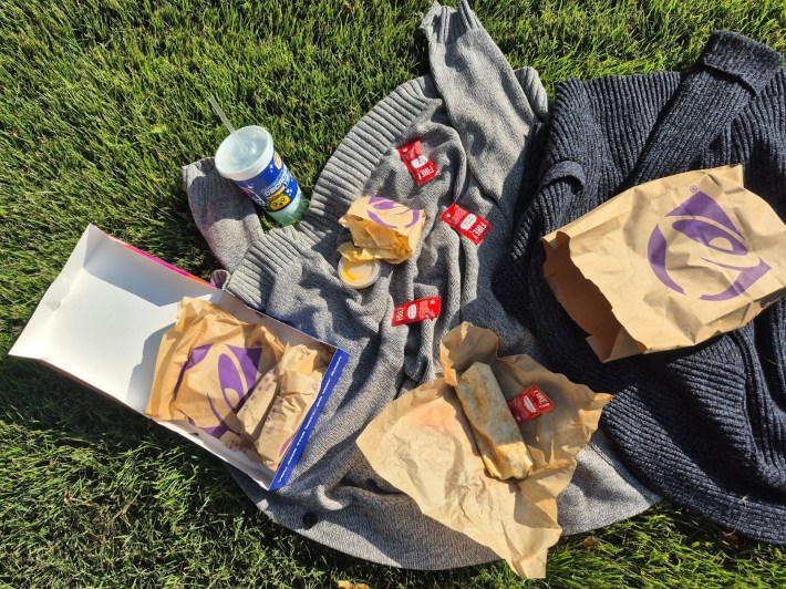 In The Picnic Basket: The Taco Bell Variety Taco Party Pack, the Braums Bag of Burgers, a Domino’s pizza, 2 large orders of McDonald’s fries, the Popeye’s 8-Piece Signature Chicken Box.
